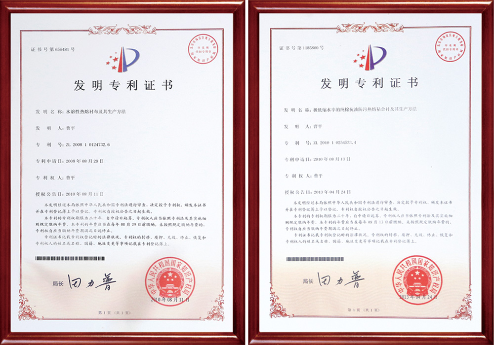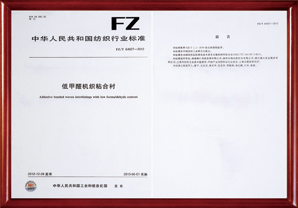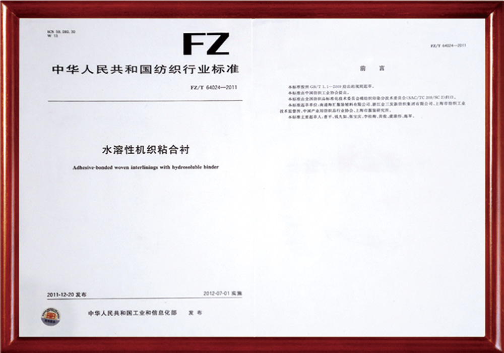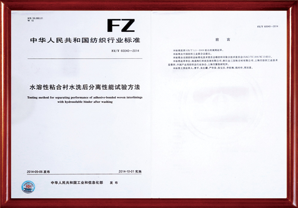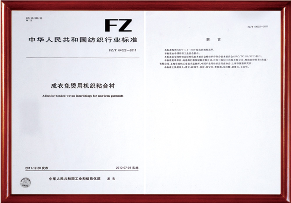 公司作為第一起草人已負責制訂國家標準1項、行業標準8項,參與制訂國家標準2 項,行業標準6項。目前已申請國家發明專利30余項,已獲得授權的國家發明專利27項,PCT專利1項;獲得高新技術產品11項,江蘇省新產品6項;申報的科技項目有多項獲得省市科技進步獎,其中中國紡織工業聯合會科技進步三等獎兩次,南通市科技進步一等獎一次,這些科技進步獎都是全國同行業零的突破,獲得南通市科技進步三等獎多次。